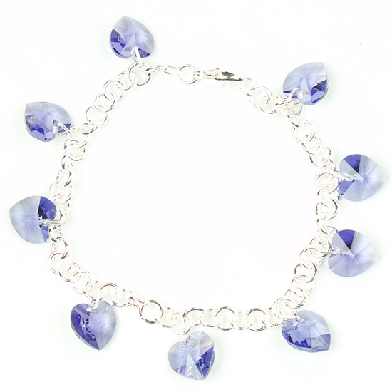 Each one of these crystal heart charm bracelets is unique and lovingly handmade made using nine 10mm Swarovski heart shaped crystals on a 19cm solid Sterling Silver (925) link bracelet. (BRA-02)